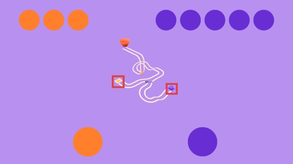 3、放入小球行驶在轨道中抵达到终点,场景中有两个终点【橙色】和【紫色】,需要2个不同颜色的小球分别到达两个终点,即可通关。