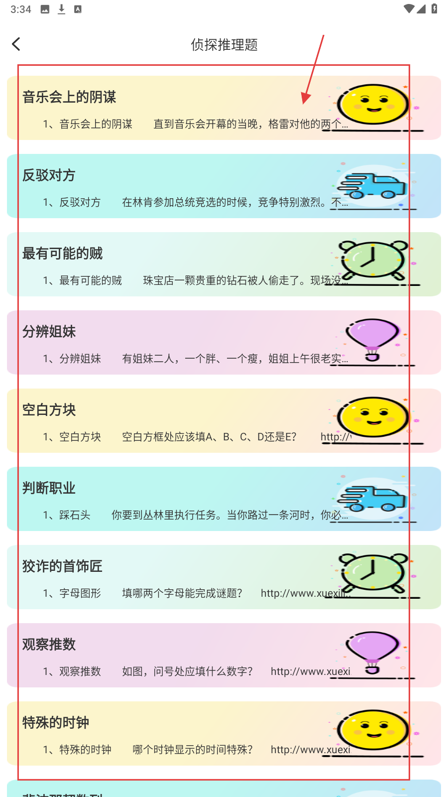 2、在【侦探推理题】列表中,选择感兴趣的题目,如【音乐会上的阴谋】。