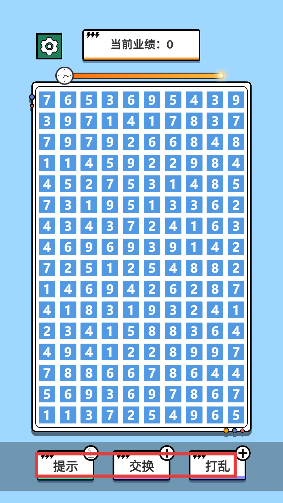 2、合理使用【提示】【交换】【打乱】功能,争取快速消除数字得分。