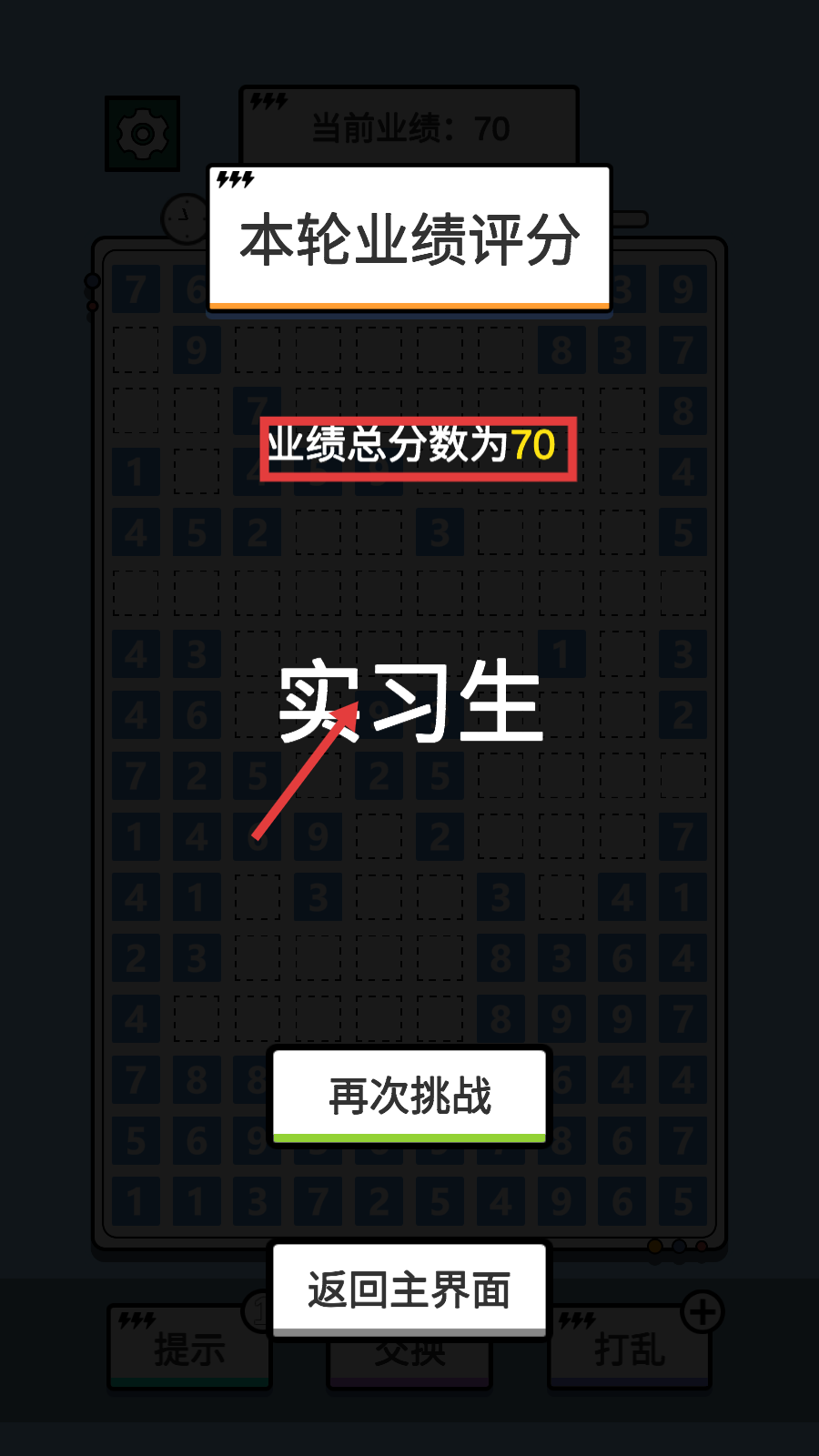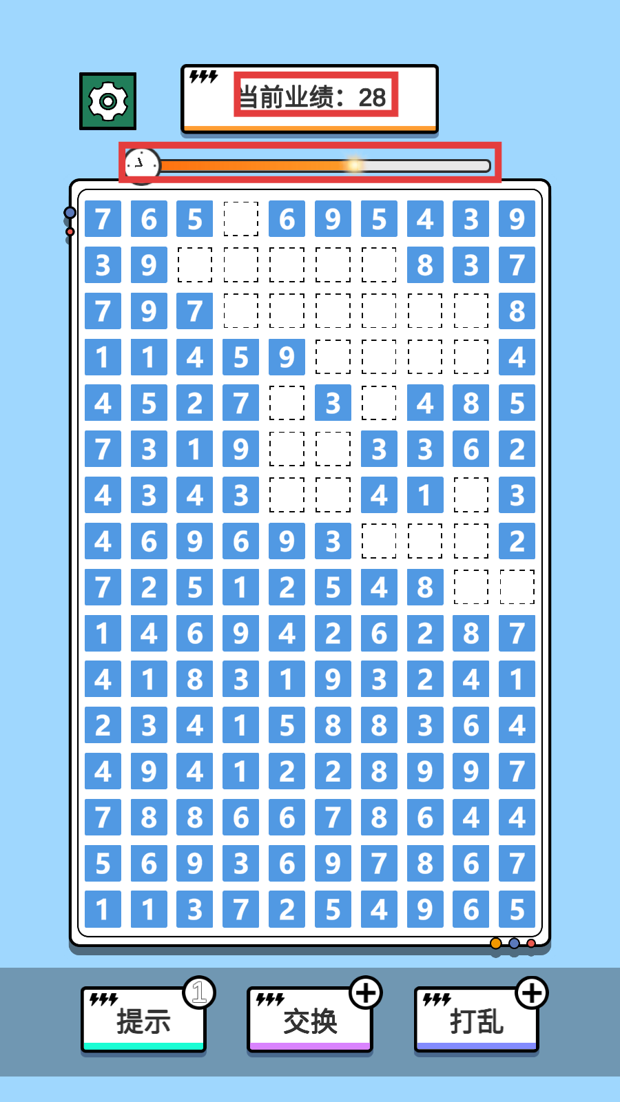 3、关注当前业绩和时间进度条,优先消除能大幅增加业绩的数字组合,避免时间耗尽。