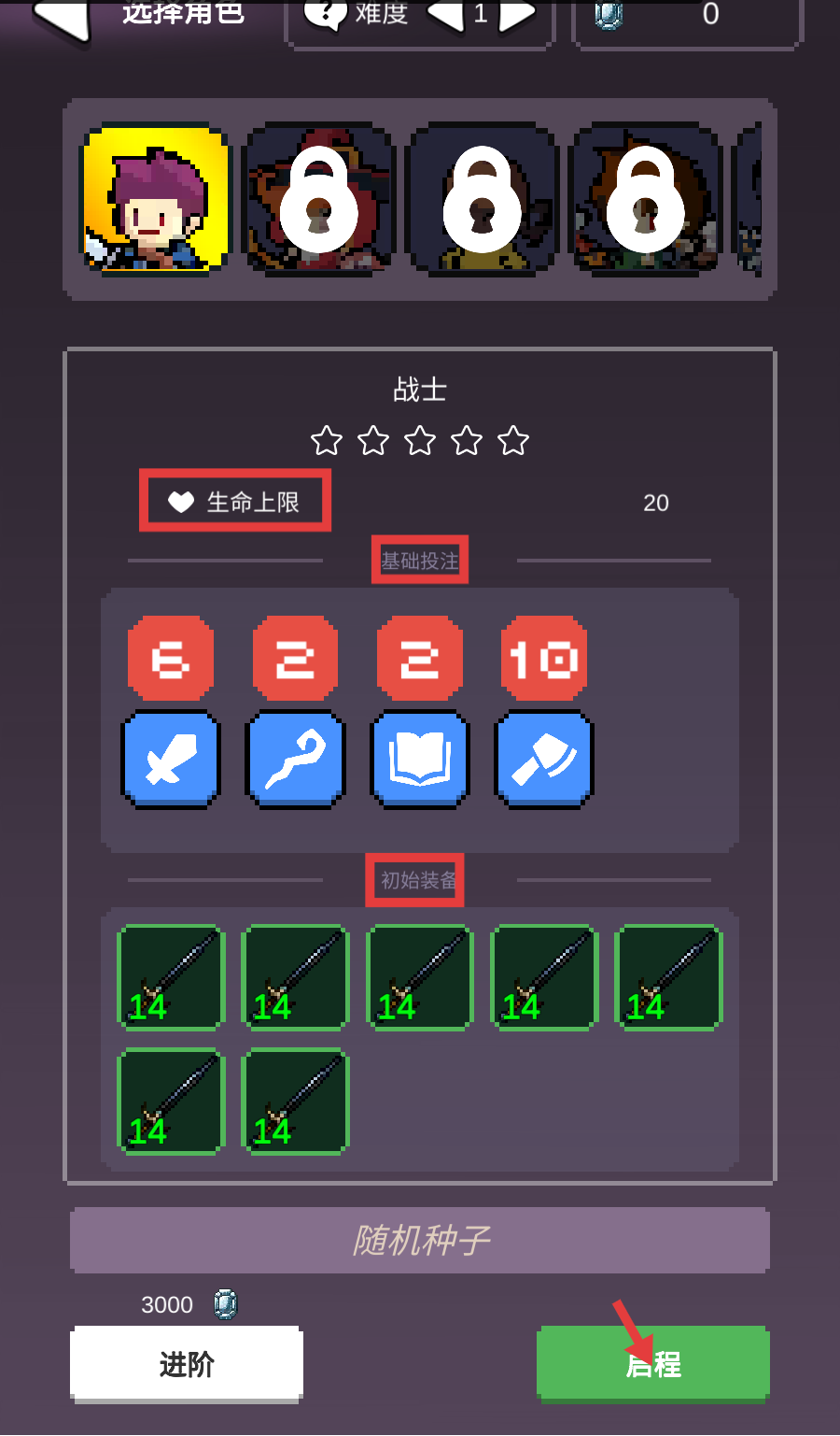 1、在角色选择界面,选【战士】利用其【生命上限】20的优势,点击【启程】开启游戏,熟悉初始装备属性。