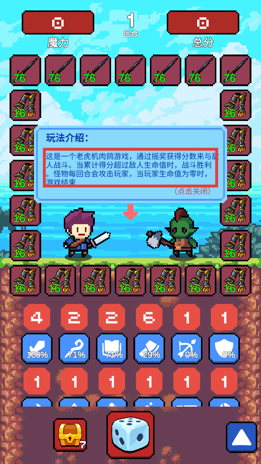 2、战斗中理解玩法,通过摇奖得分数,目标是累计【总分】超敌生命值获胜,留意怪物每回合攻击,避免生命归零。