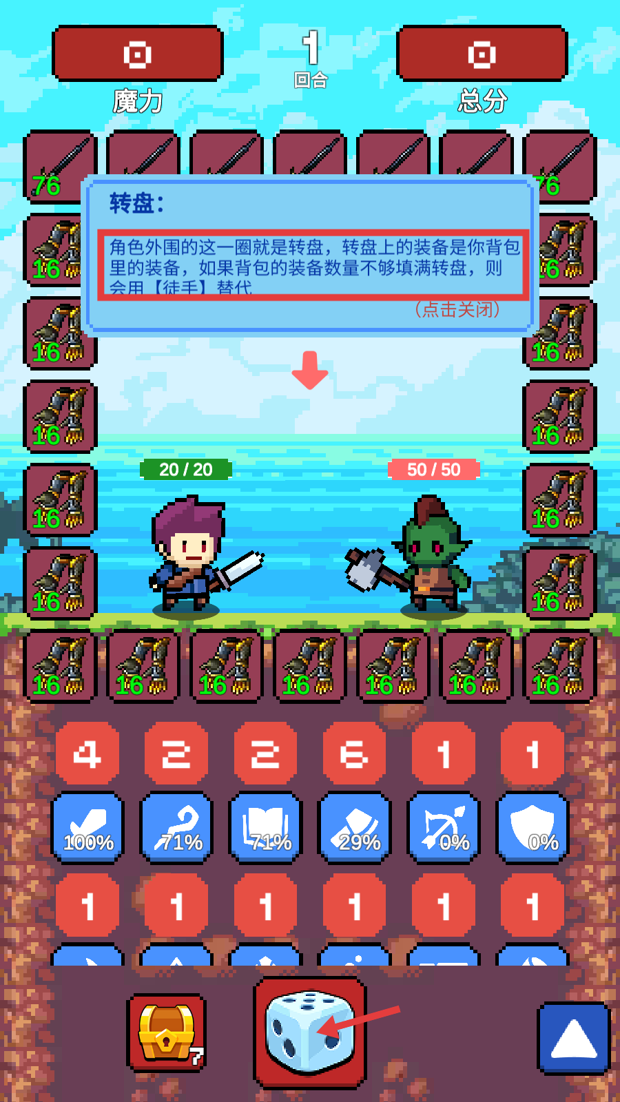 3、关注【转盘】机制,了解装备填充规则,合理利用转盘装备,适时点击【骰子】获取分数攻击敌人。