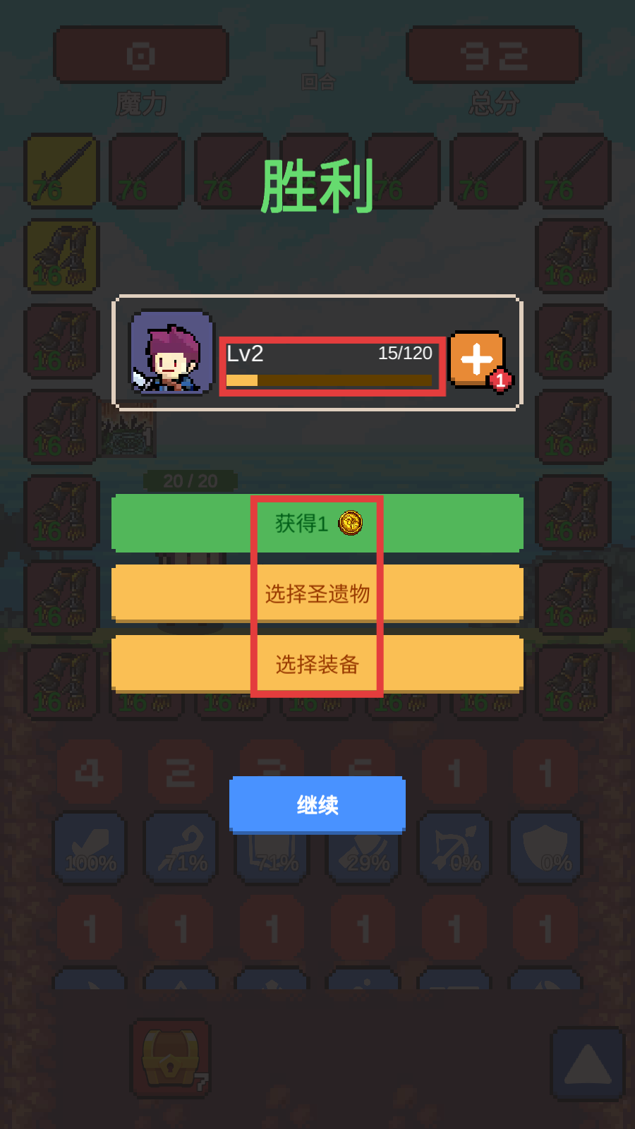 4、胜利后优先选合适的【圣遗物】或【装备】提升实力,点击【继续】,注意积累经验升级,提升角色等级。