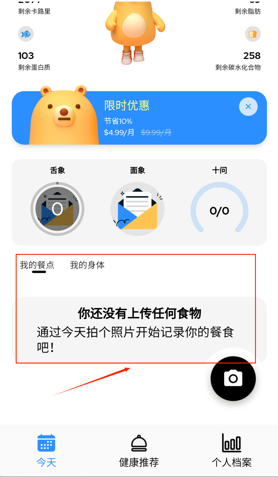 2、营养页查看详细分析报告,了解蛋白质、碳水等含量,记录用餐时间和心情呀。