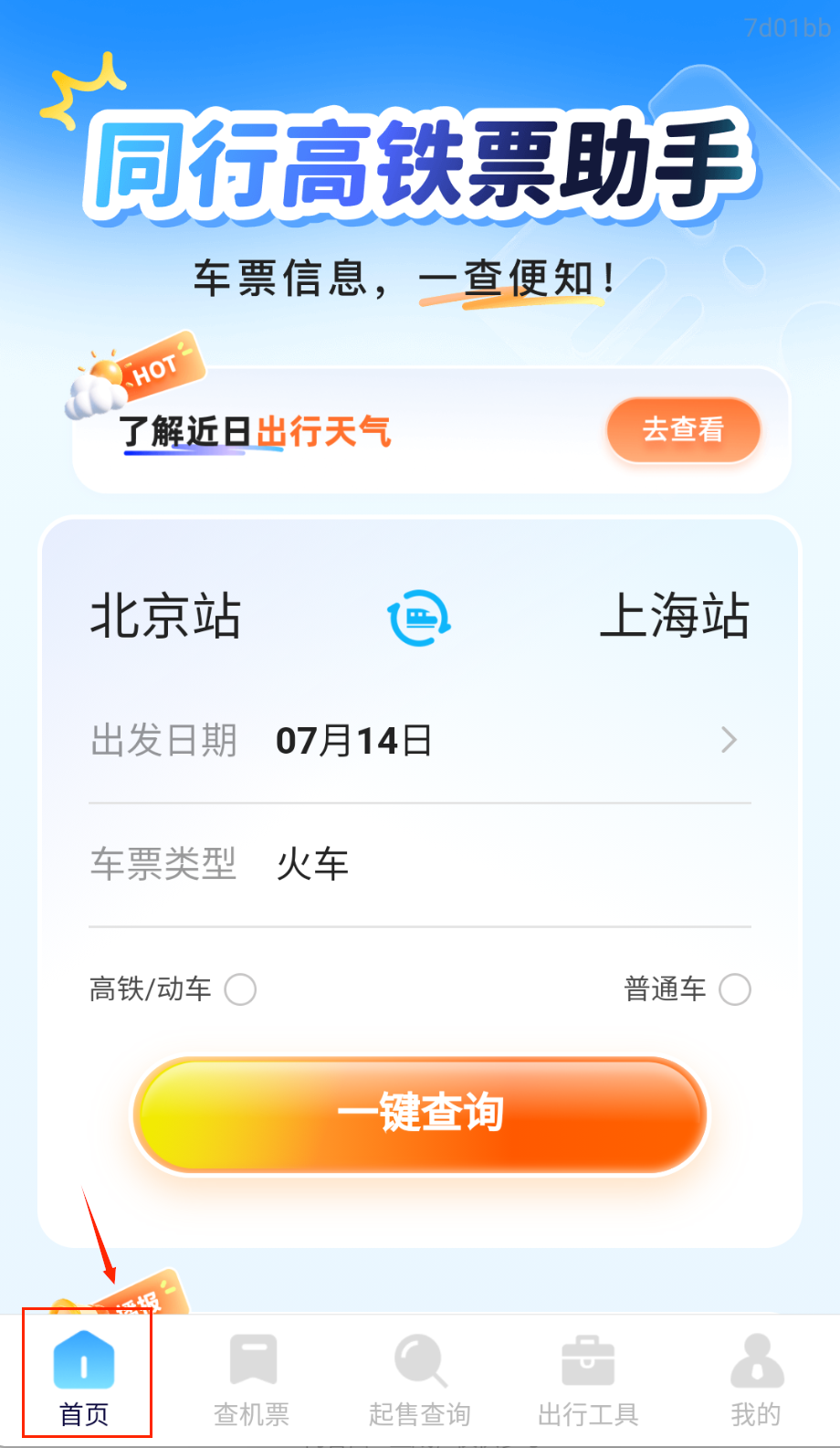 1、首页输入出发地和目的地,选择出行日期,筛选车次类型,查看余票信息和票价哦。