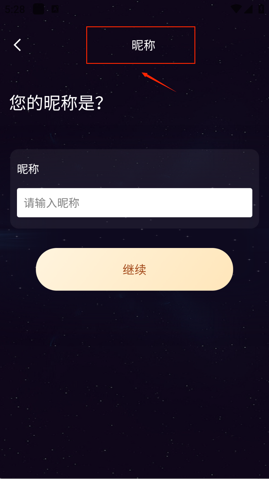 1、打开软件在星空背景界面,找到"昵称"输入框,输入2-10个字符的昵称,点击浅黄色"继续"按钮就能进入下一步啦。