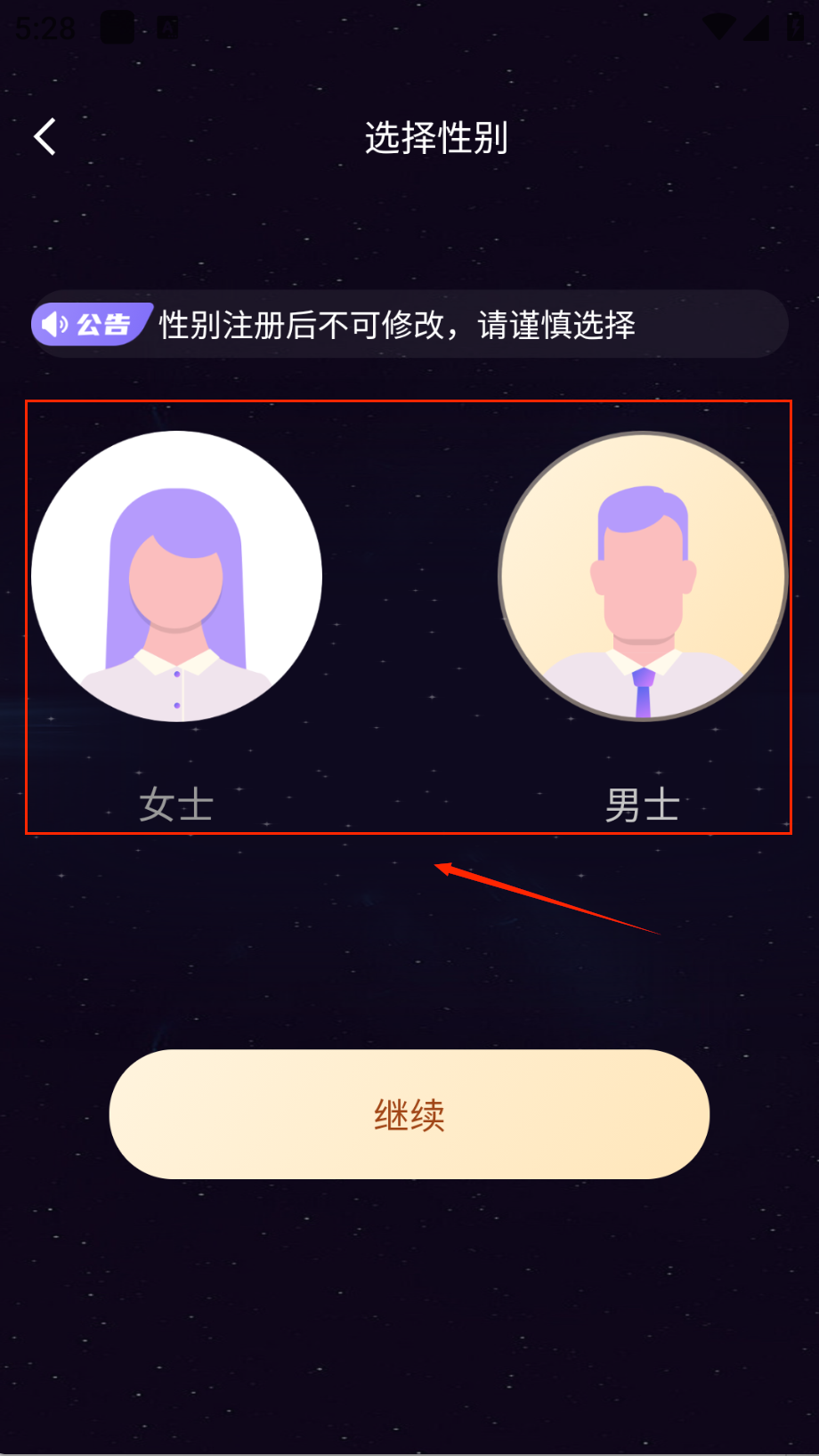 2、选择性别时要慎重,点击紫色头发女士或男士头像,注意注册后不能修改,确认后点"继续"按钮就完成啦。