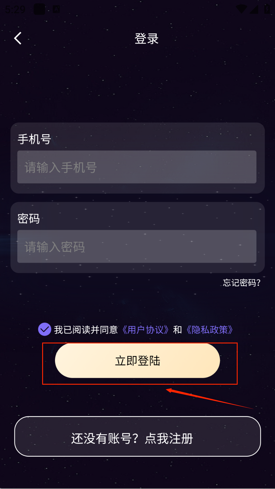 4、登录时输入手机号和密码,记得勾选用户协议选项,检查无误后点击黄色"立即登陆"按钮就能进入啦。