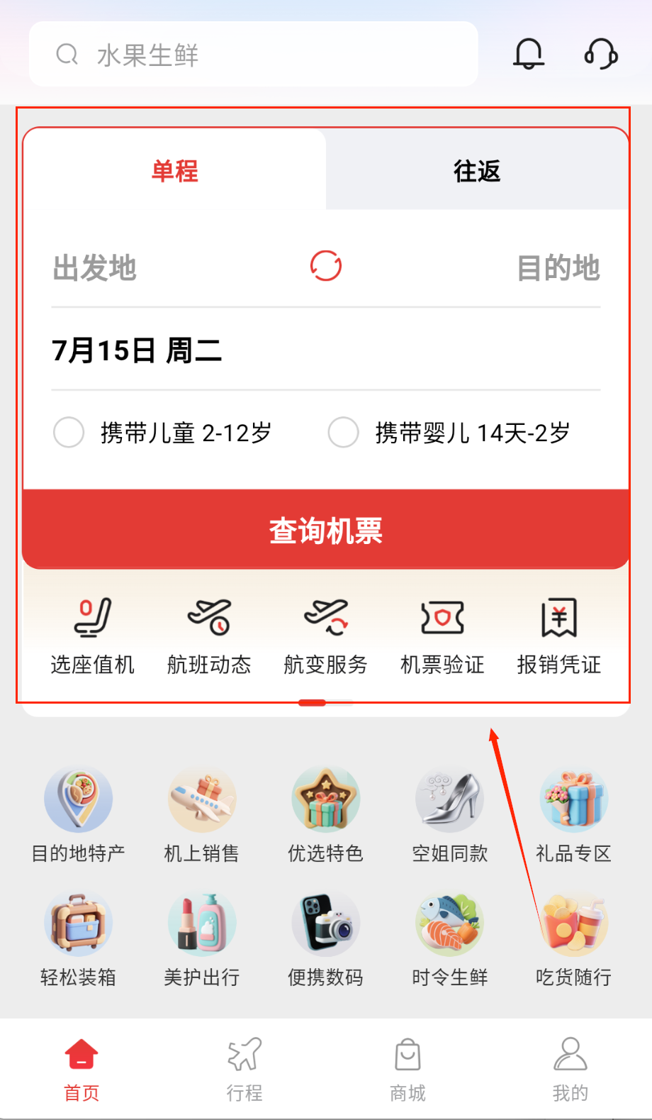 2、机票页筛选出发地目的地,对比航班时刻,选择舱位等级,使用积分抵扣啦。
