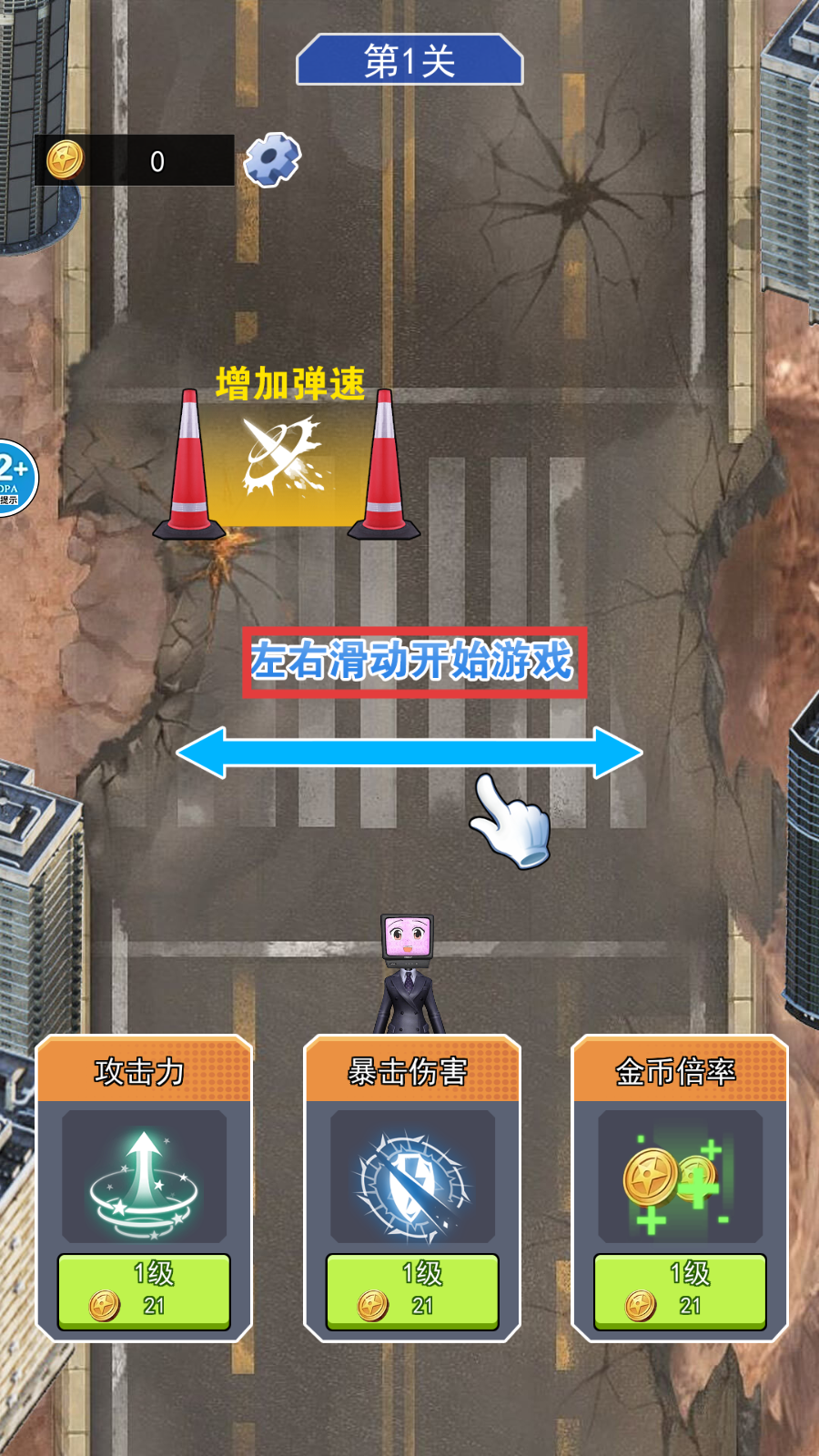 1、按提示【左右滑动】操控角色,前期优先利用金币升级【攻击力】【暴击伤害】【金币倍率】属性。