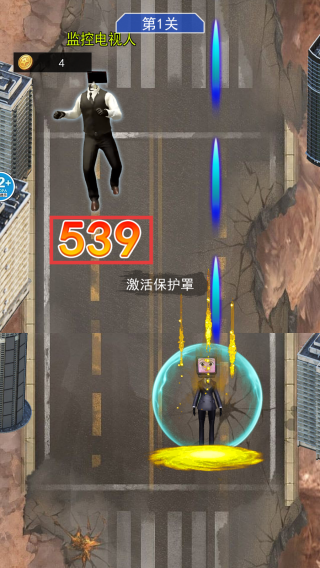 3、遇到怪物如【监控电视人】时,观察敌人血量,可以消灭就攻击,消灭不了就躲避,适时激活【保护罩】抵御伤害。
