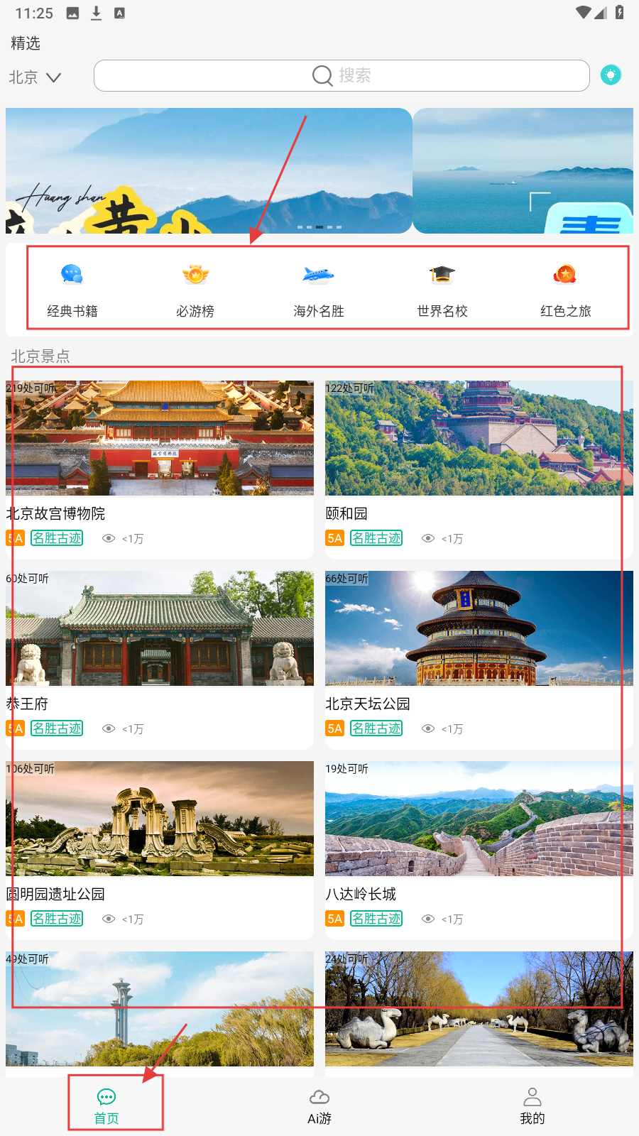 1、进入应用后,在首页选择感兴趣的景点分类,如【必游榜】,查看推荐景点。