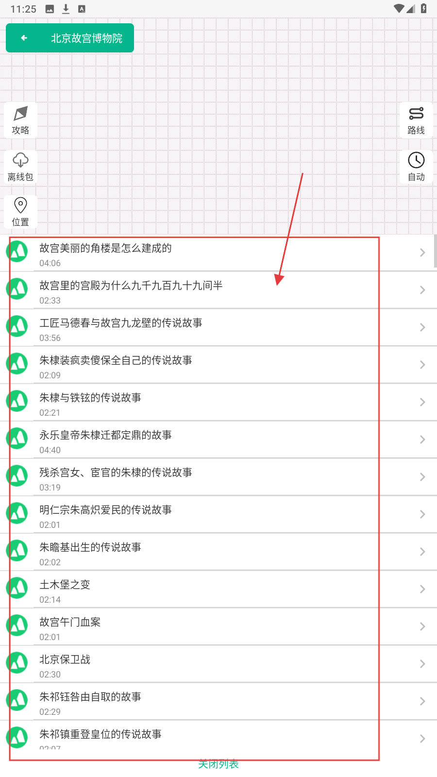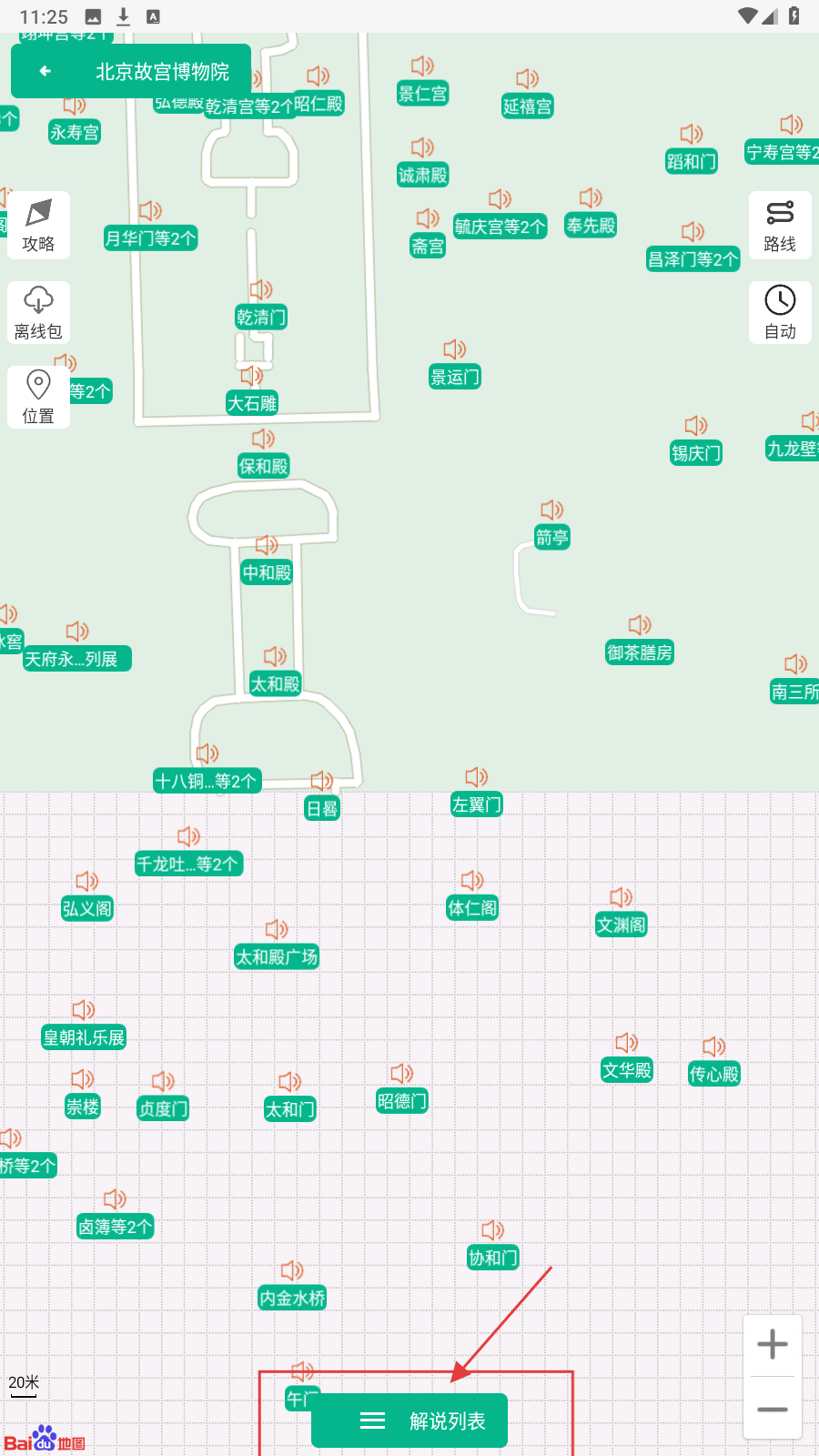 2、进入景点详情页面后,点击【解说列表】按钮,查看景点相关解说内容。