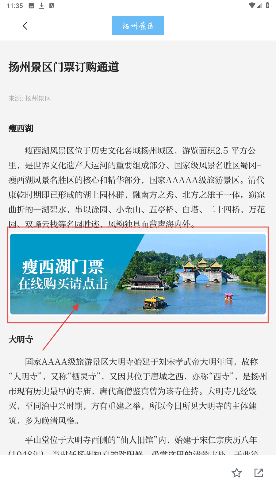 3、进入景点详情页面后,点击【瘦西湖门票在线购买请点击】按钮,进入购票页面。