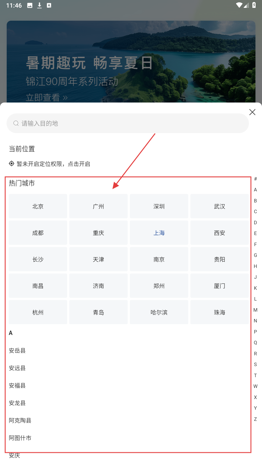 1、在城市选择页面中,选择感兴趣的城市,如【上海】,进入酒店预订页面。