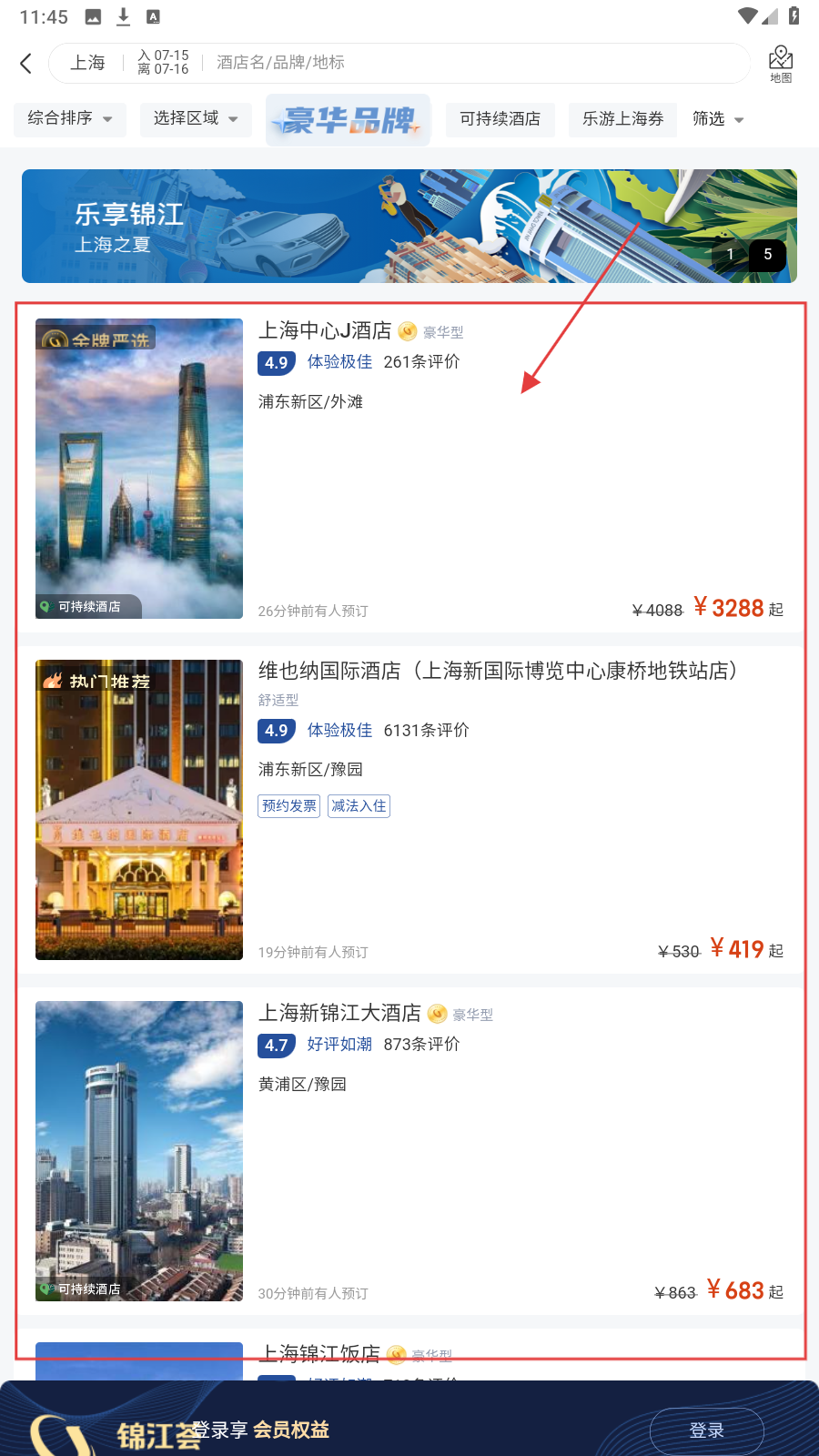 3、在酒店预订页面中,浏览推荐的酒店,选择感兴趣的酒店查看详情。