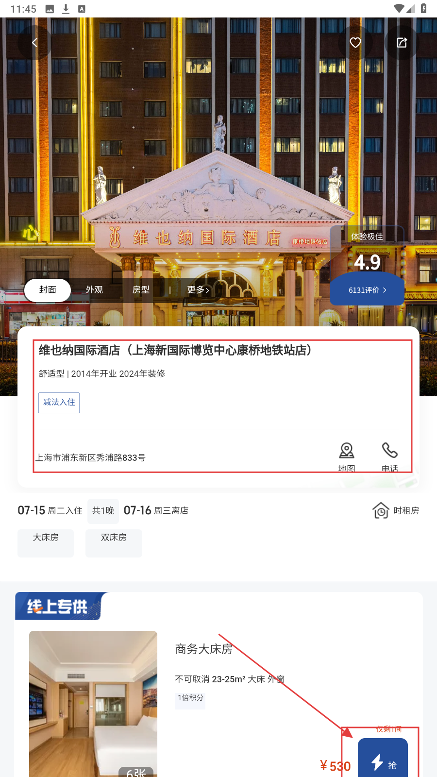 4、进入酒店详情页面后,选择房型并点击【抢】按钮,完成酒店预订。