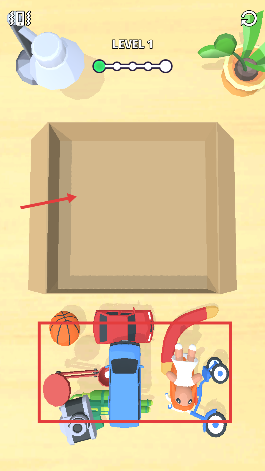 1、按照界面提示将物品依次放入盒子,注意摆放顺序和空间利用。