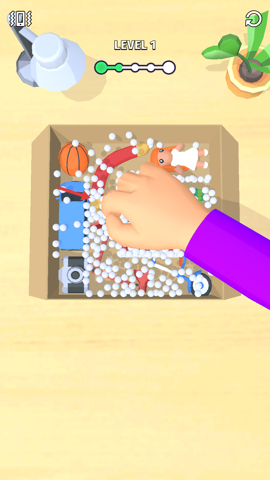 2、放入玩具后,长按屏幕放出白色小球,填满盒子,用来确保玩具不容易损坏。