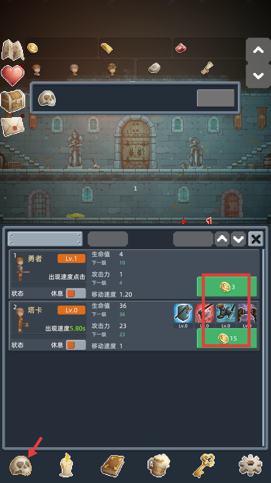 1、前期优先积攒金币,根据角色【勇者】和【塔卡】的需求,合理花费金币提升等级与装备。