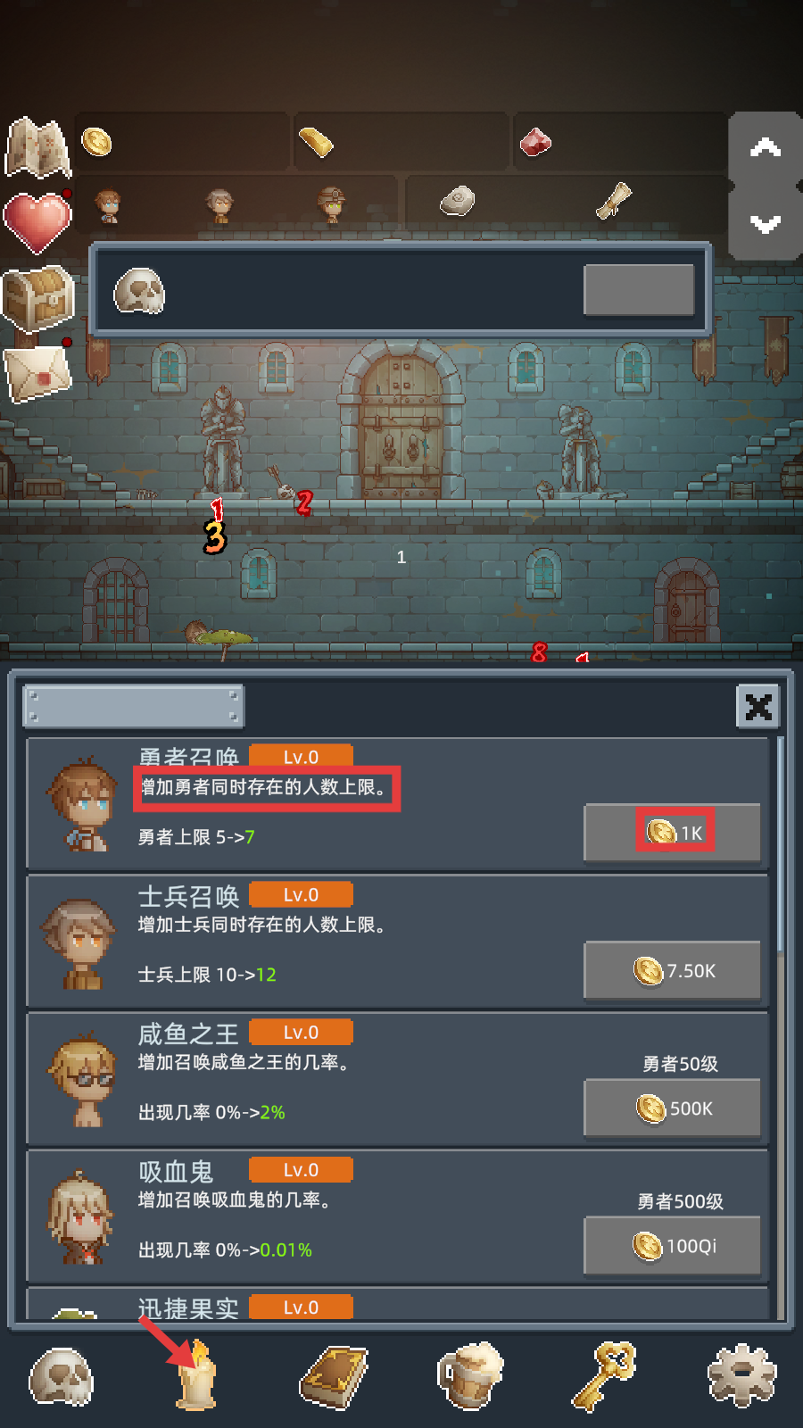 2、通过【勇者召唤】功能,消耗金币提升勇者同时存在人数上限,增强战斗实力。