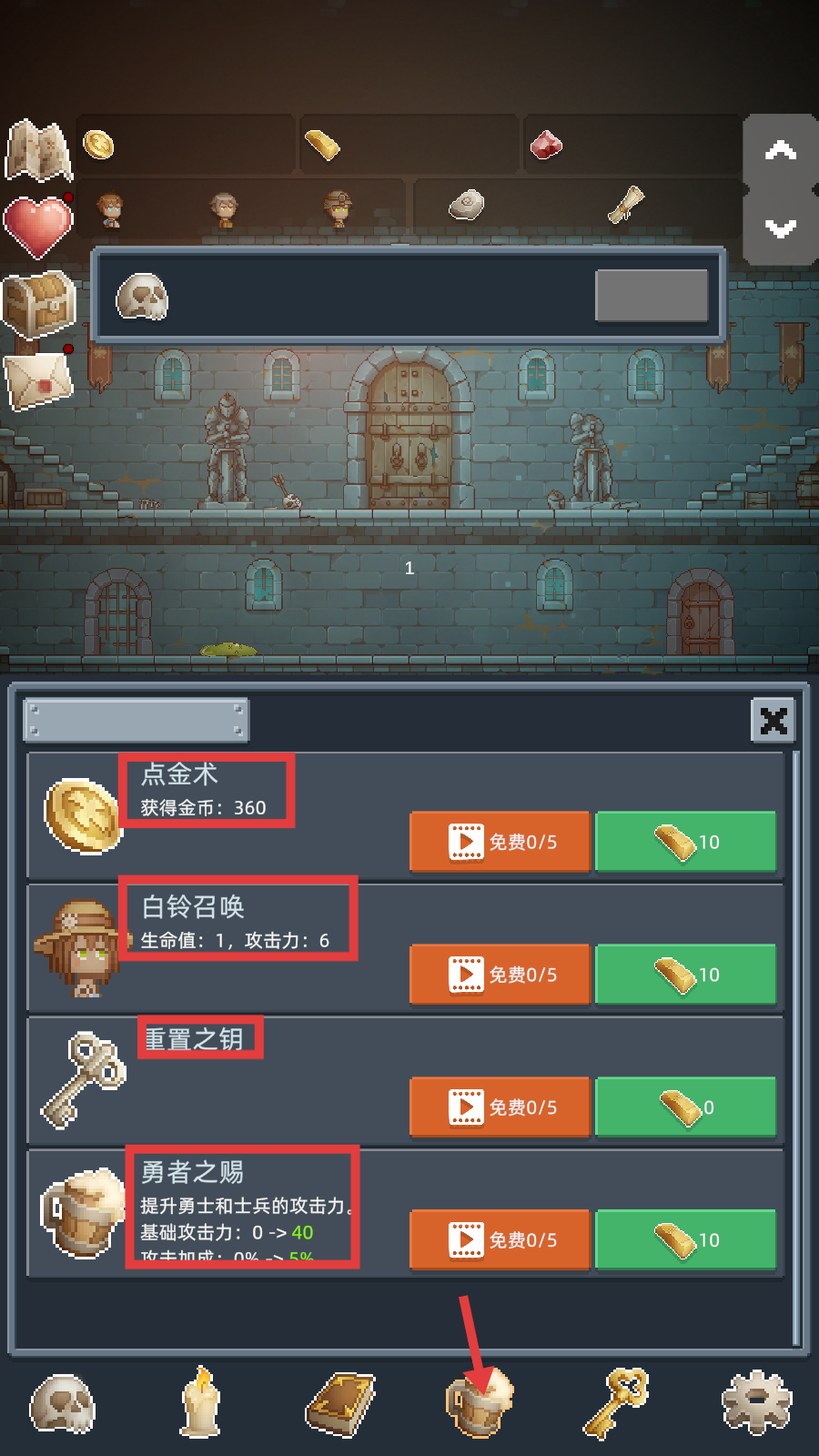 3、利用【点金术】【白铃召唤】等功能,按需获取金币和新角色,适时使用【勇者之赐】提升攻击力。