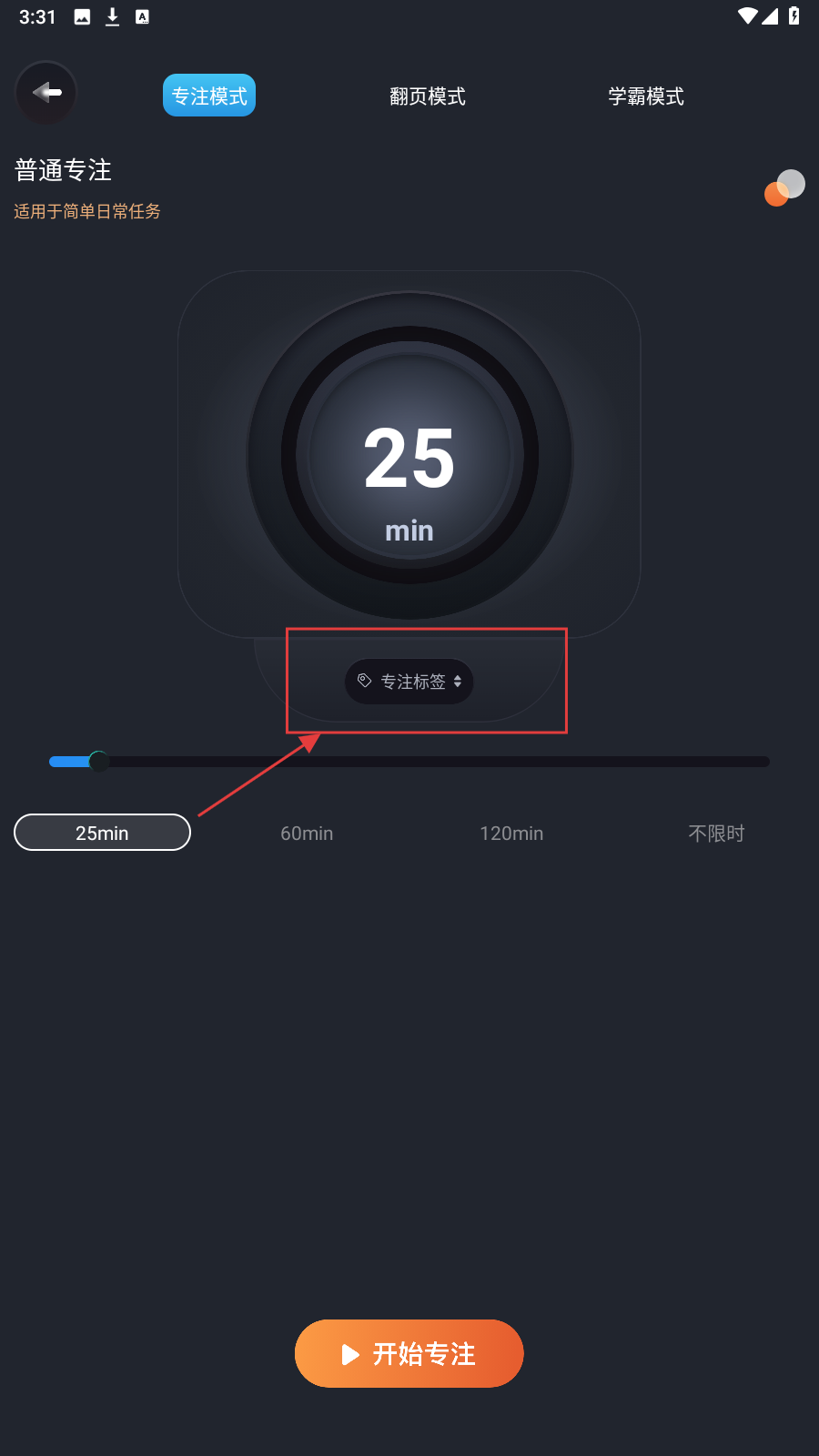1、进入应用后,点击【开始专注】按钮,进入专注模式设置页面。