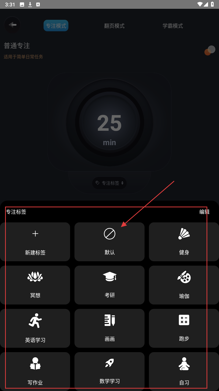 3、选择专注标签,如【默认】、【健身】等。专注标签选择完成后,点击【开始专注】按钮,开始专注计时。