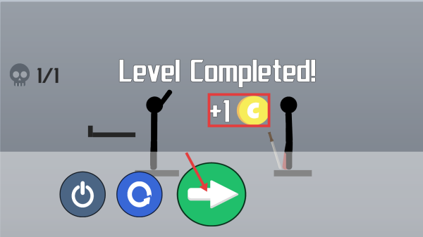 2、将握住的【刀】向前扔出,只要碰到敌人,即可通关,获得金币奖励,点击绿色按键进入下一关。