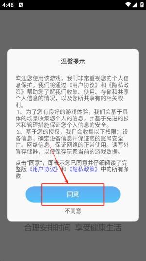 1、阅读弹出的温馨提示与用户协议,确认无误后点击“同意”继续。