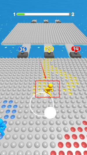 3、与对手同场竞技时,找准时机踩踏对手的颜色区域,削弱对方优势的同时扩大自己的地盘,为造桥和冲关创造有利条件。