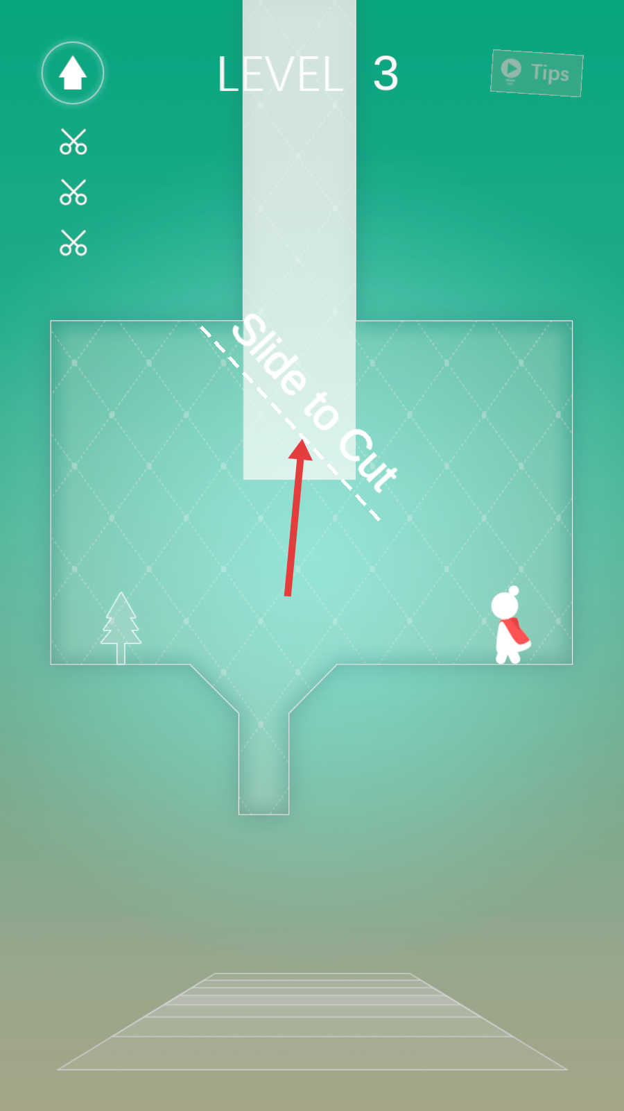 3、游戏关卡中,按照【Slide-to-Cut】提示,滑动屏幕切割场景元素,帮助角色到达目标位置,如树木处。