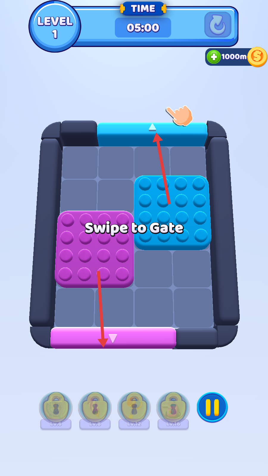 1、观察关卡中不同颜色的积木块布局,按照提示【SwipetoGate】,滑动积木块使其移动到对应颜色的出口位置。