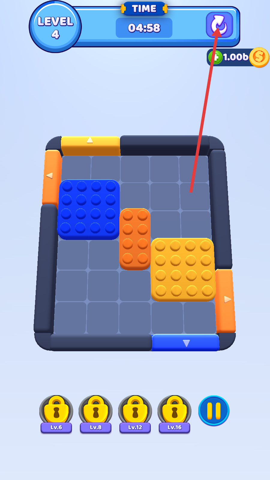 4、若操作失误,可点击屏幕右上角的重置按钮重新开始当前关卡,不断尝试以顺利通过关卡,解锁后续更高难度关卡。