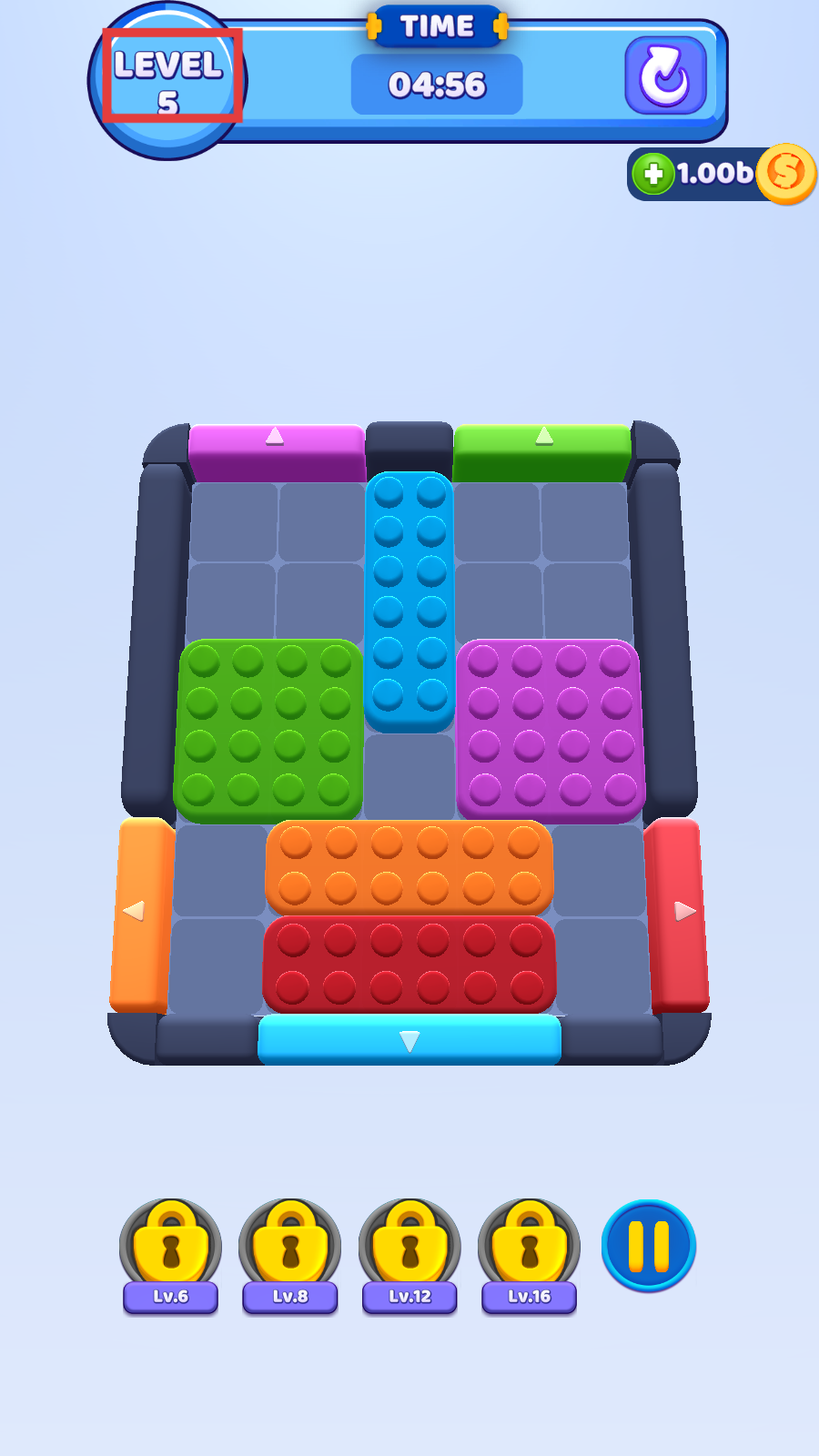 2、注意屏幕上方的倒计时,在规定时间(如5分钟)内完成积木块的移动操作,成功通关可获得金币奖励。