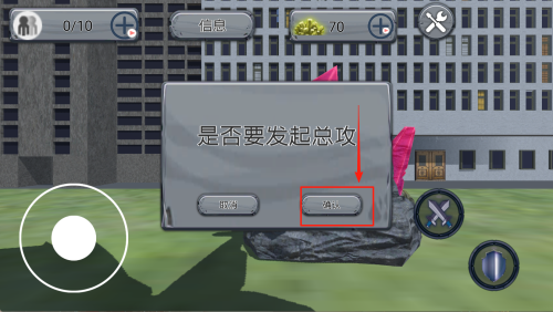 3、看到“0/10 信息 是否要发起总攻”提示时,点击“信息”了解敌方情况后再决定是否发起总攻。