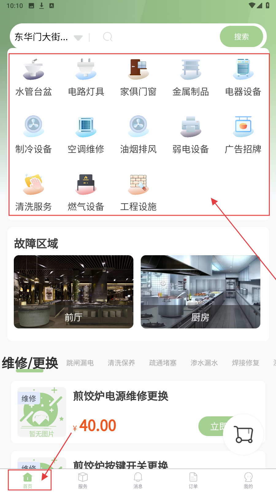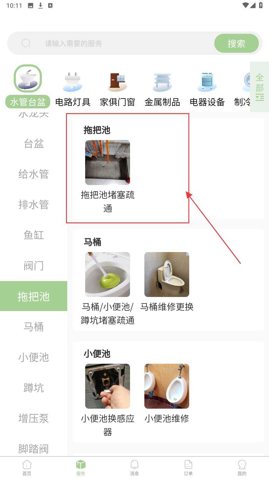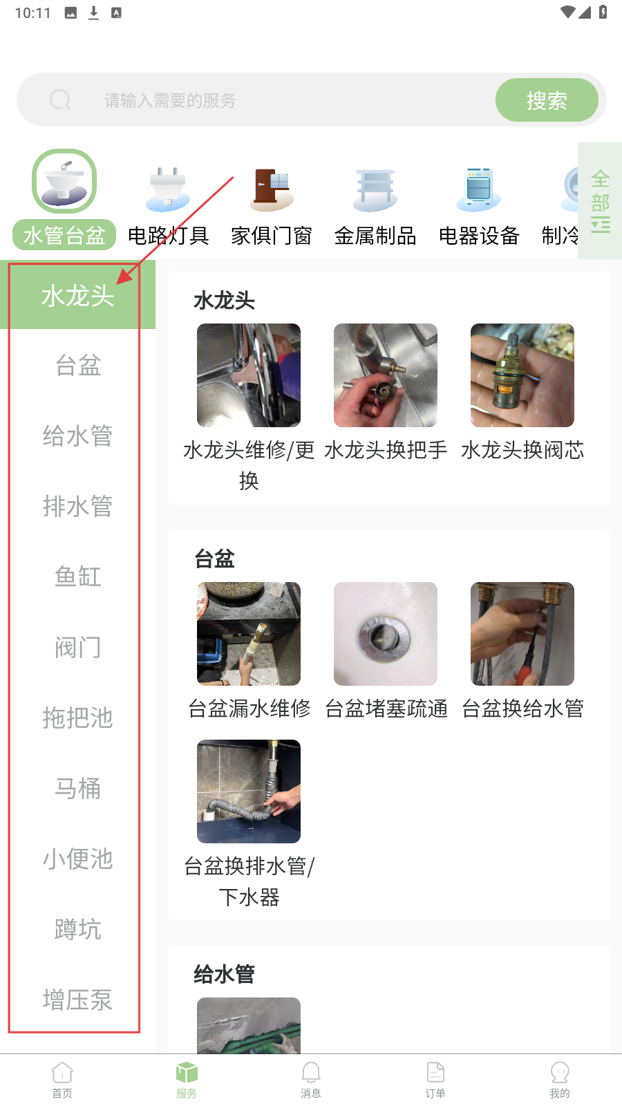 1、进入应用,在【首页】选择需要维修的服务类别,如【水管台盆】。