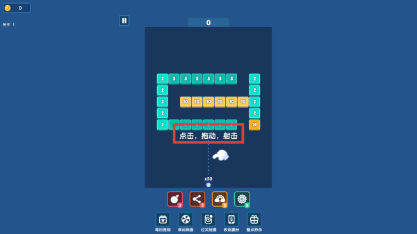 2、关卡1中,按照【点击,拖动,射击】的操作提示,精准击打方块,熟悉游戏基础玩法。