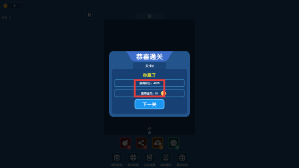 4、通关后,查看【获得积分】和【赢得金币】,总结经验,点击【下一关】挑战新关卡。