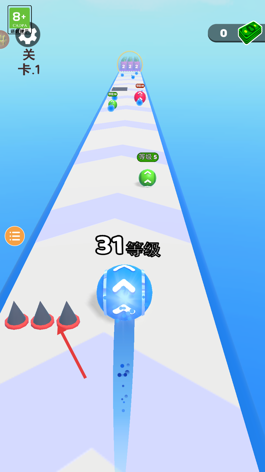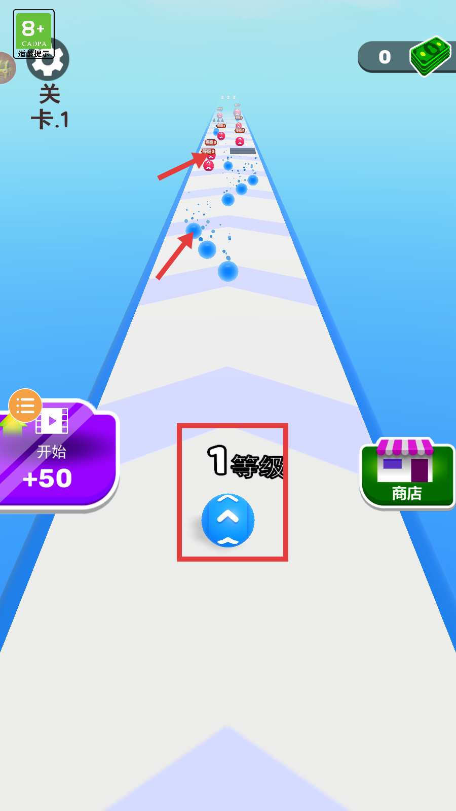 1、操控【1等级】小球,沿路径收集蓝色小球,提升小球等级和实力。