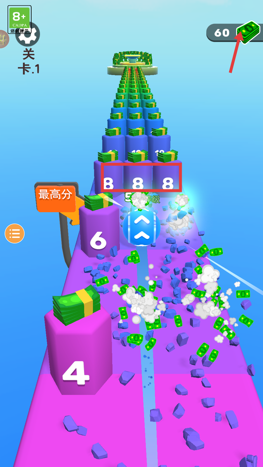 3、在最后冲分的时候,撞碎多少方块就能获取多少【钞票】奖励。