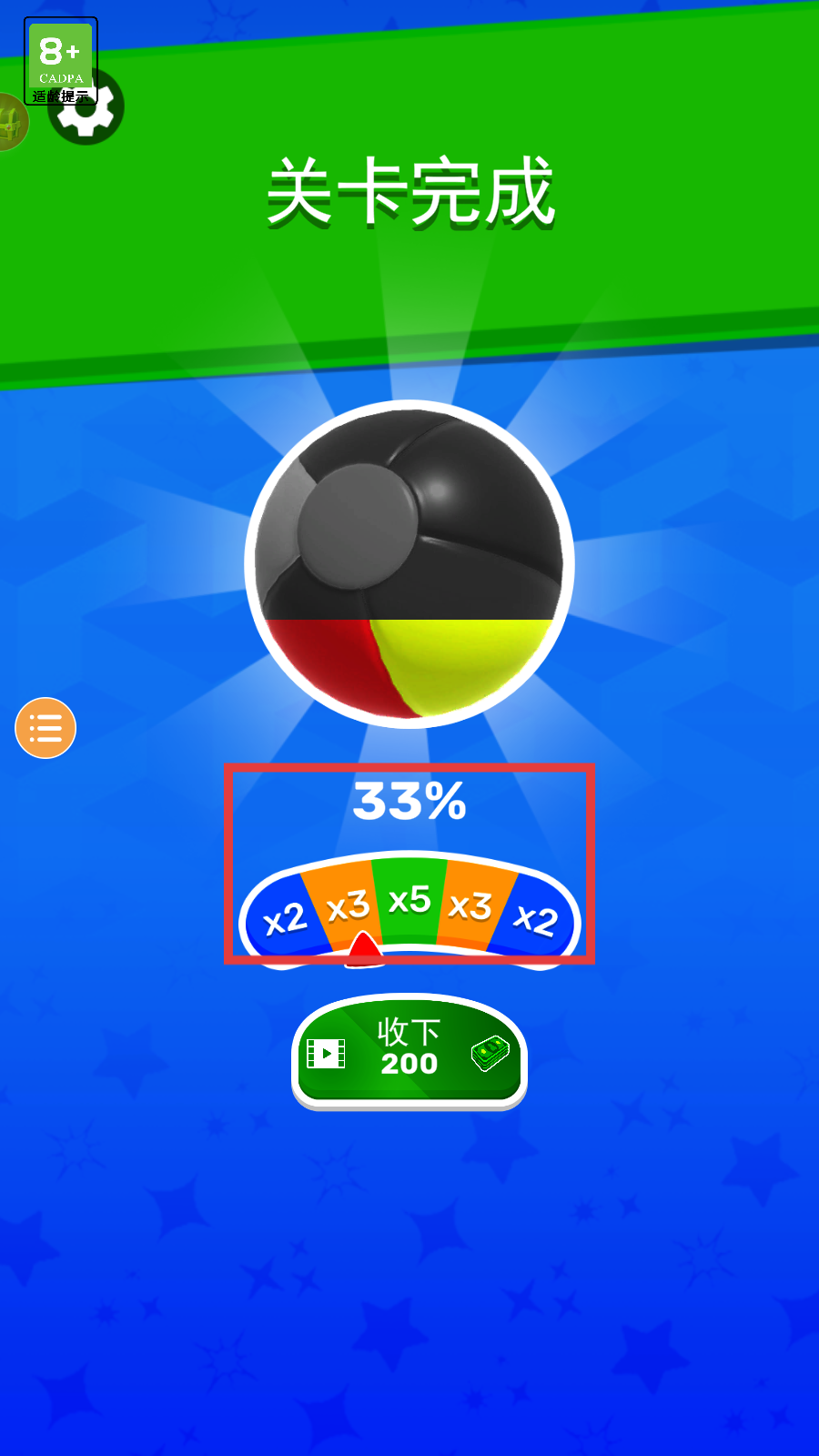 4、关卡完成后,看准【33%】指针区域,争取获得更高倍数奖励,点击【收下200】领取奖励。