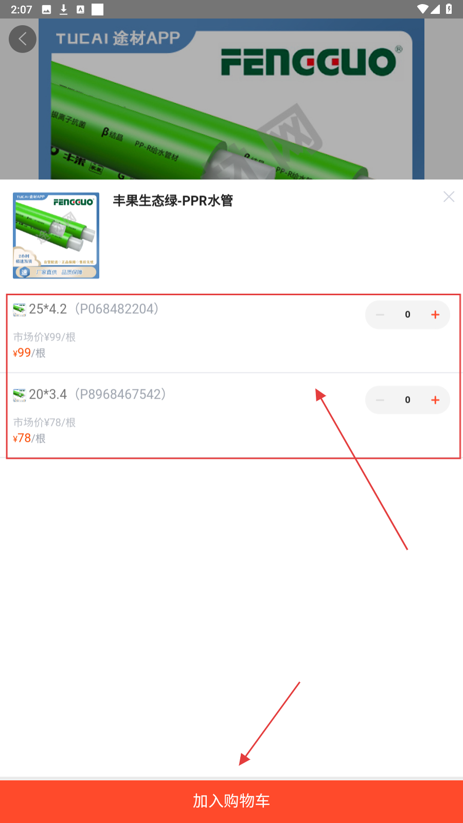 4、在购物车页面,可选择不同规格商品,确认后再次点击【加入购物车】完成添加操作。