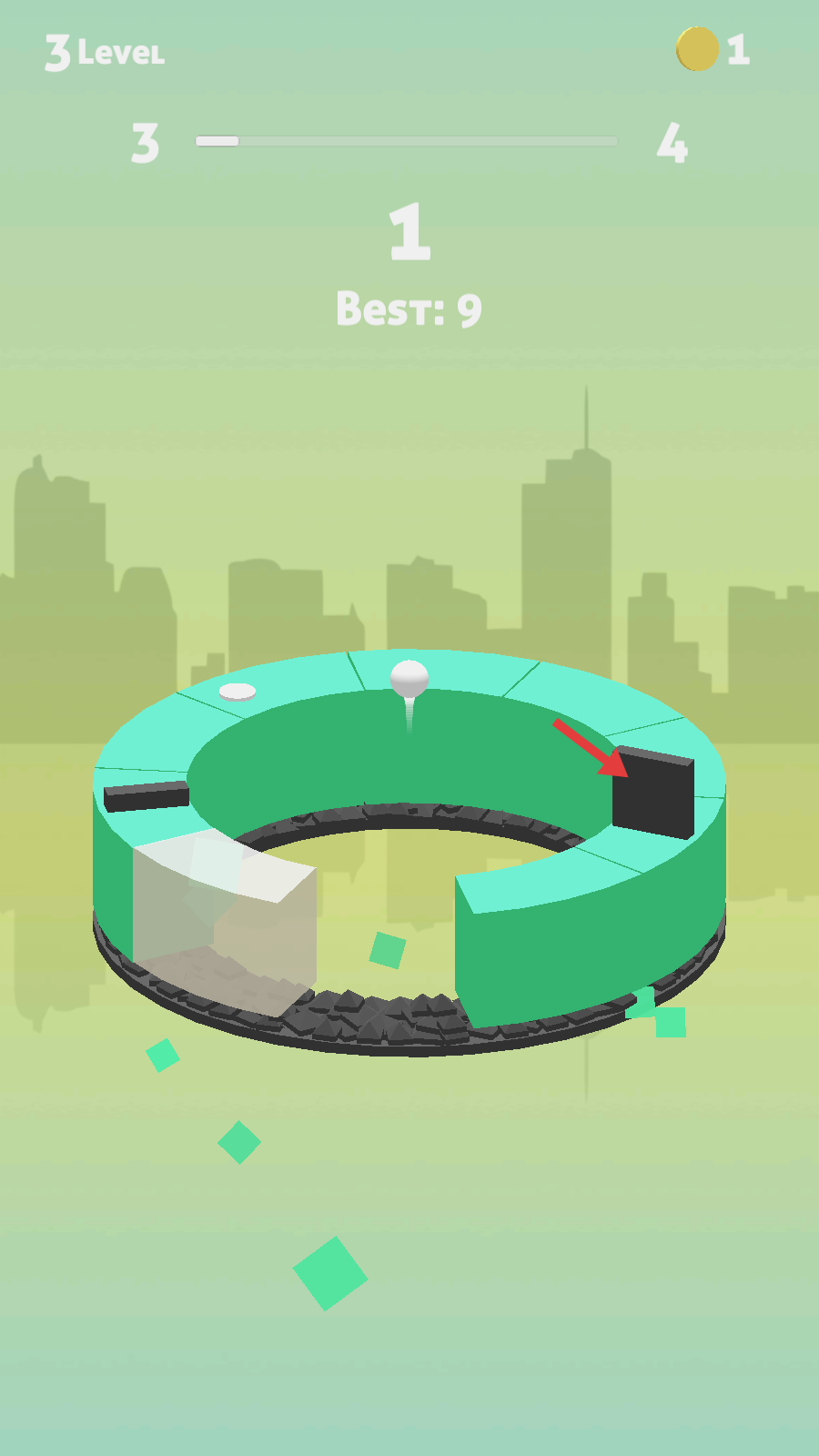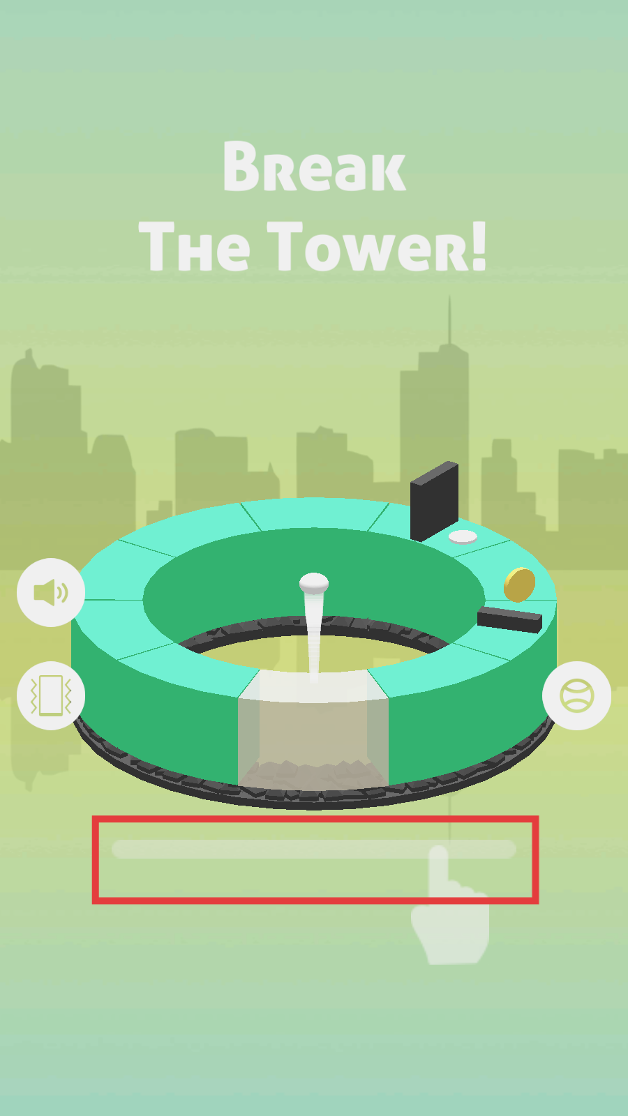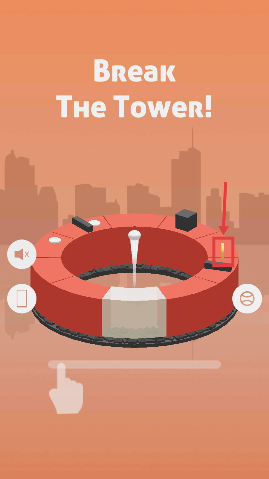 1、看到【Break-The-Tower!】提示,通过屏幕下方滑动条操控白色球,撞击绿色圆环上的绿色方块。