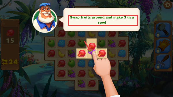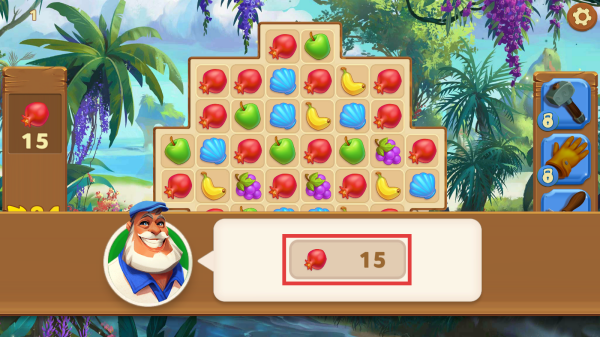 1、明确目标是收集【15】个石榴,可通过交换水果位置,使三个相同水果连成一行来消除。
