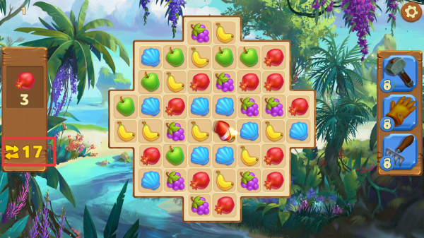 4、右侧有道具(如锤子、手套等),在步数紧张或难以形成三连消除时,合理使用道具辅助完成收集目标。