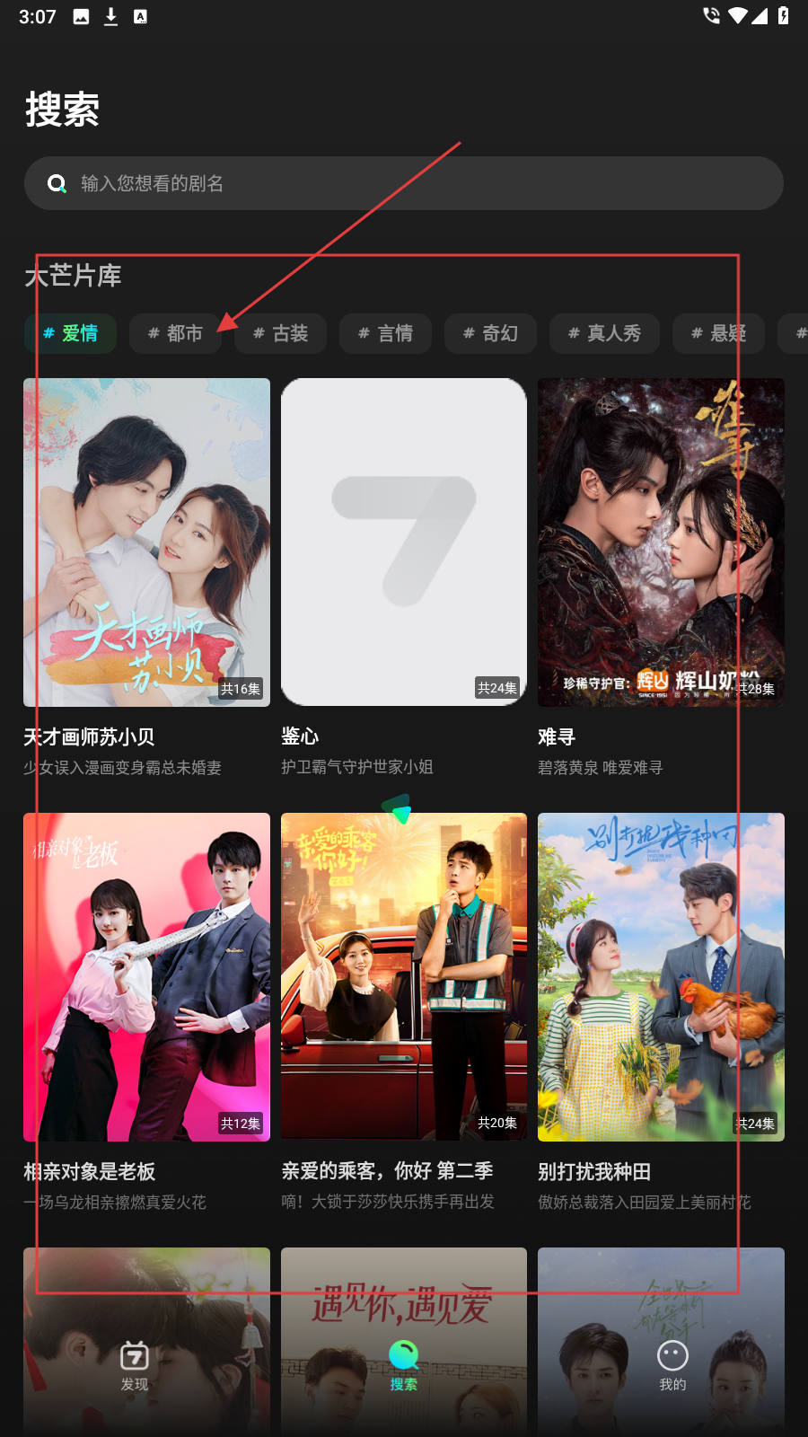 1、打开剧集应用,在首页大芒片库中,可通过爱情、都市等分类标签,快速筛选出感兴趣的剧集。