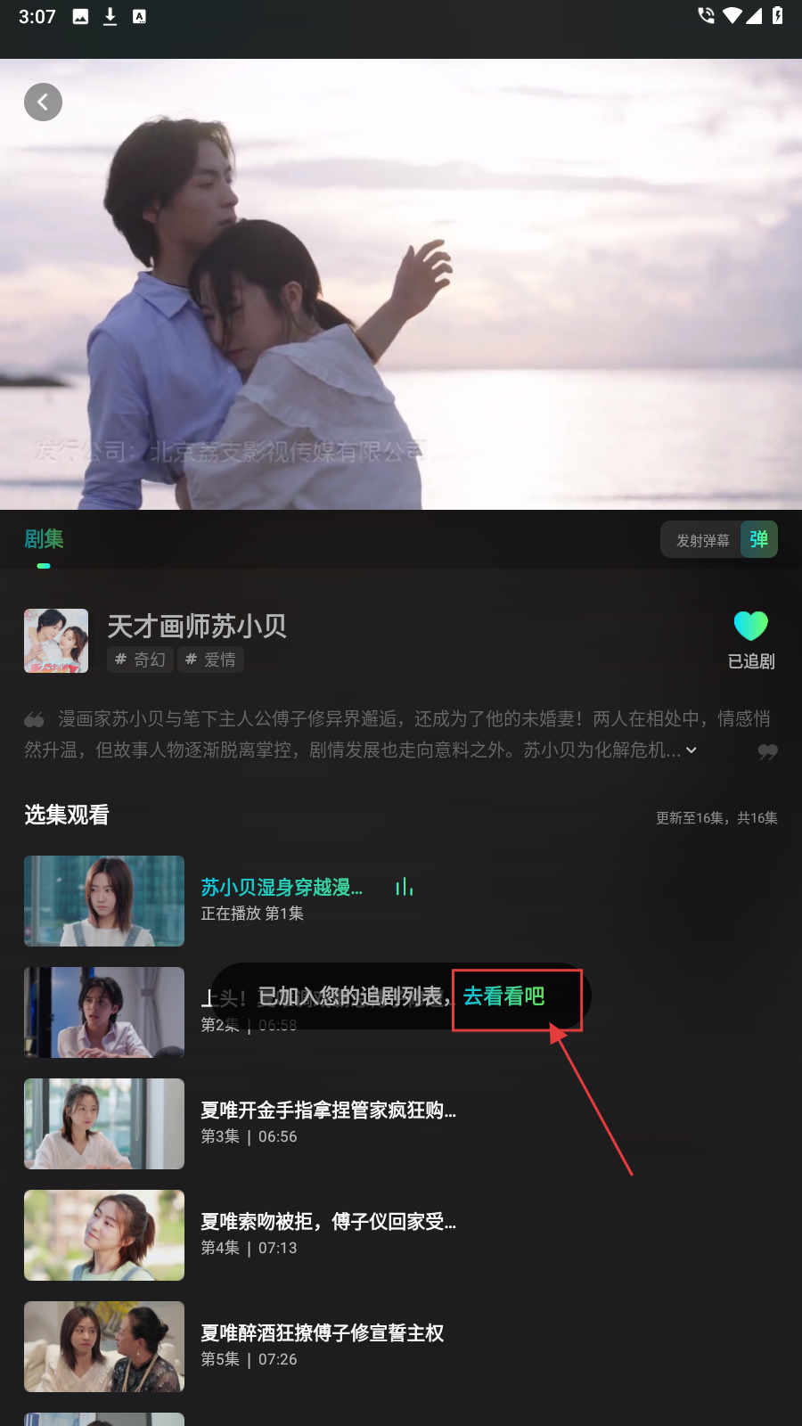3、加入追剧列表后,可点击提示框中的【去看看吧】,快速查看追剧列表中的剧集。