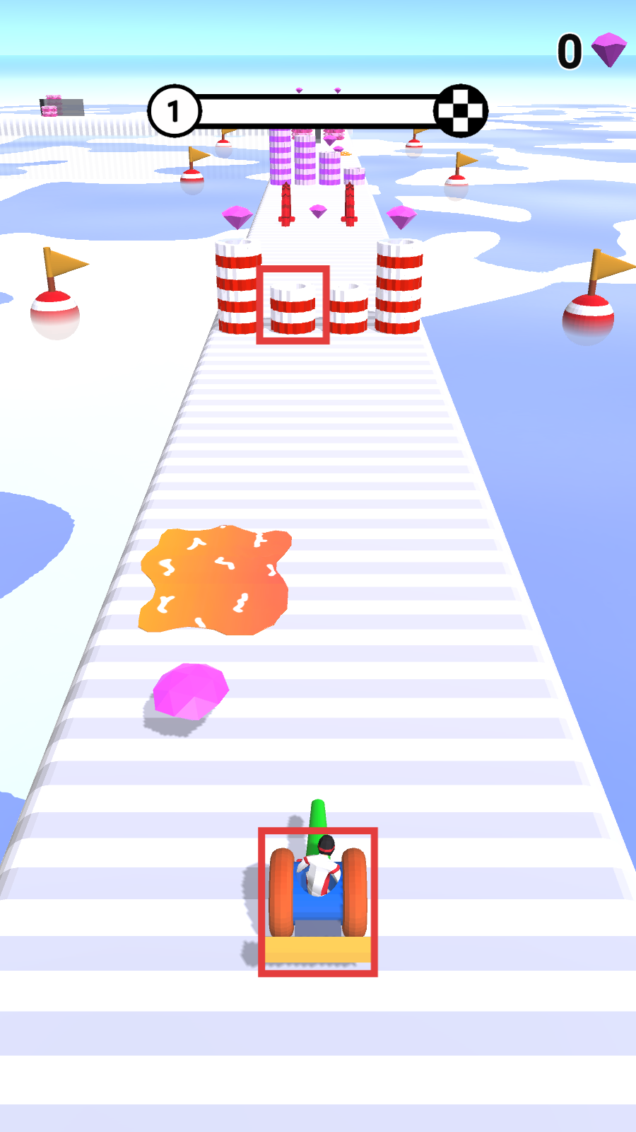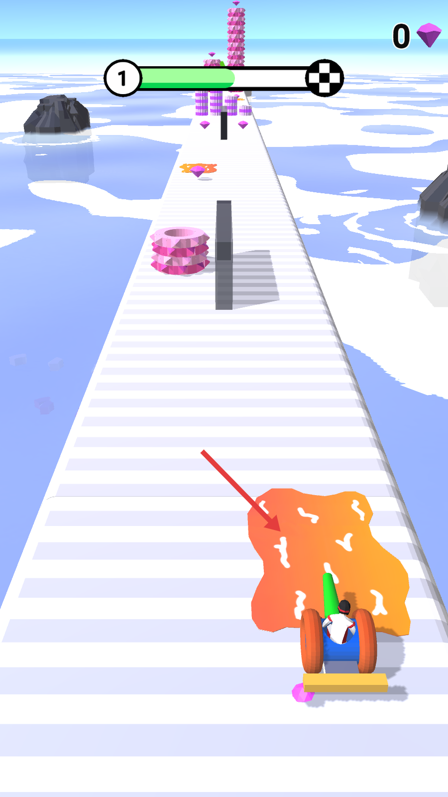 1、操控载具在赛道上前进,滑动屏幕控制小车的左右,点击屏幕,小车射出炮弹,击碎前方的障碍物。